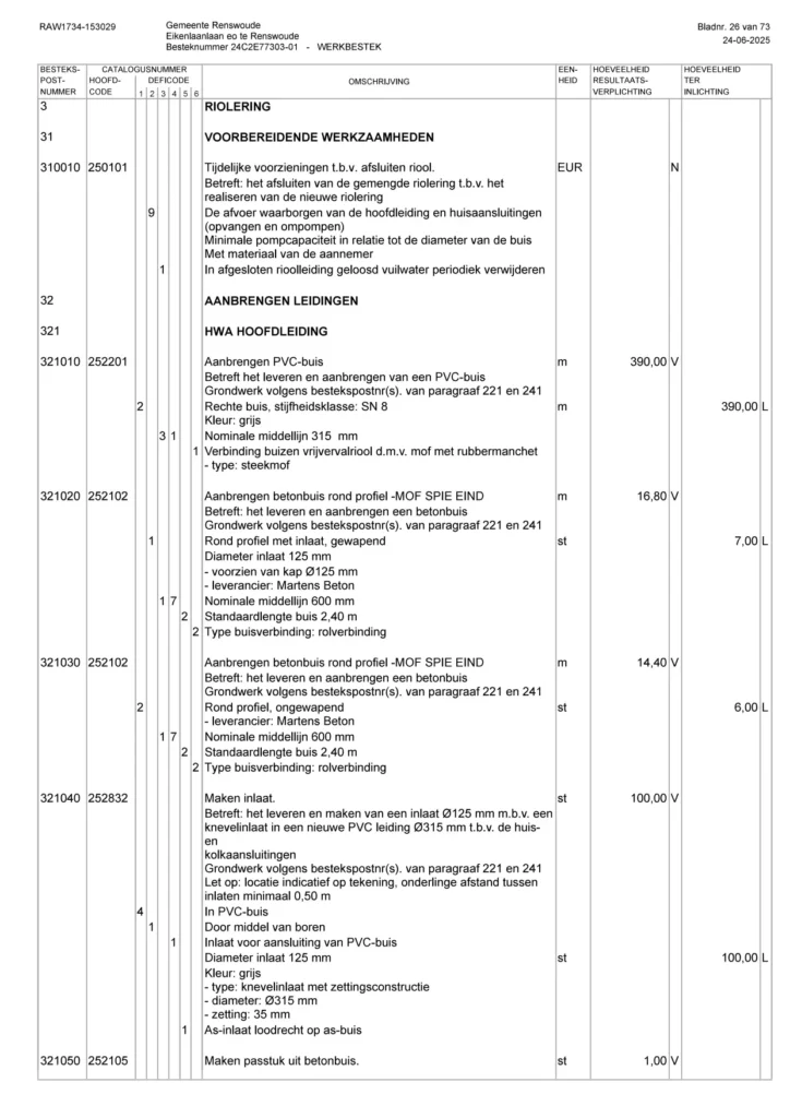 Wij vertalen de tekeningen naar een helder, projectspecifiek bestek aan de hand van de RAW-systematiek. Ook de duurzame keuzes, zoals het aantal vierkante meters op te nemen en te hergebruiken betontegels of stoepranden, worden hierin goed omschreven. Dit resulteert in een complete inschrijfstaat met eenheidsprijzen, zodat de aannemer precies weet wat hij moet maken en waar hij aan toe is.